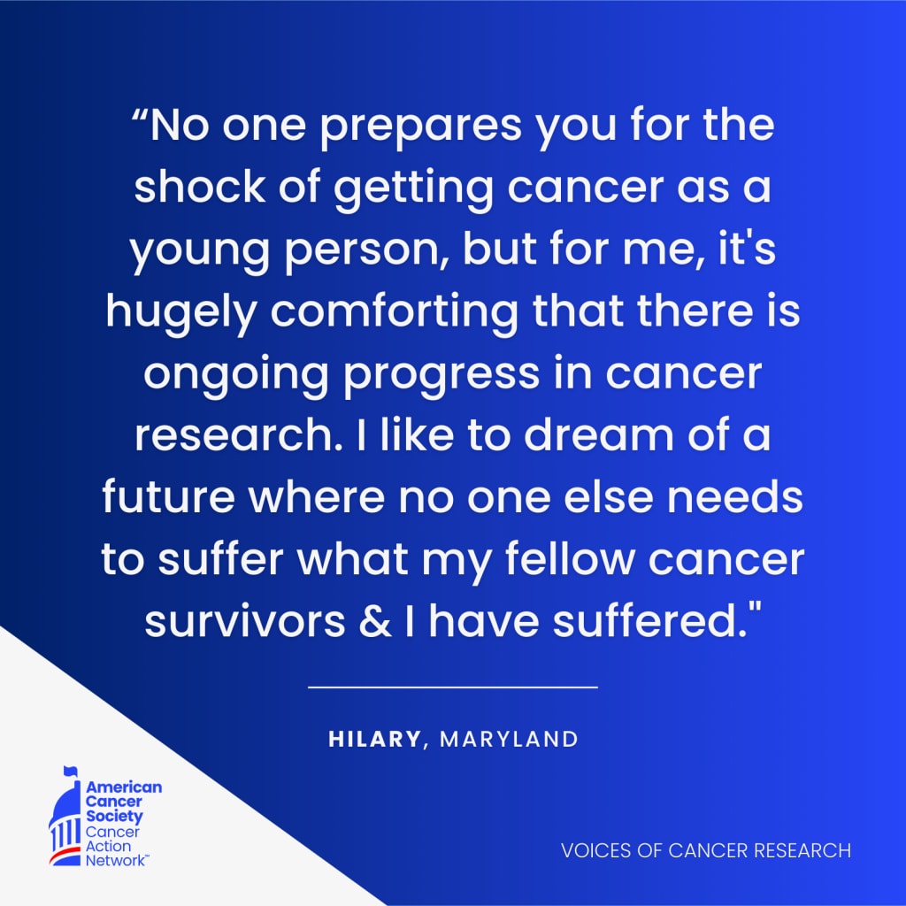 Her answer came from research. Biomarker testing, made possible by years of scientific progress, showed that chemotherapy would not benefit her type of cancer. That result spared her from the harsh side effects of chemo and gave her a strong hope of one day becoming a mother. “I don’t think I would be where I am today without it,” Hilary says. Today, Hilary has finished her hormone therapy and is embracing her life as a PhD student at Johns Hopkins. After years of teaching preschool and caring for infants and toddlers, she is pursuing her passion for education research and has taught graduate-level education courses. She remains grateful for the science that guided her treatment and for the future that cancer research helped protect.