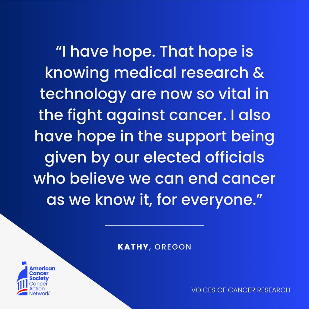 I have hope. That hope is knowing that medical research and technology are now so vital in the fight against cancer. I also have hope in the support being given by our elected officials, who believe we can end cancer as we know it for everyone.