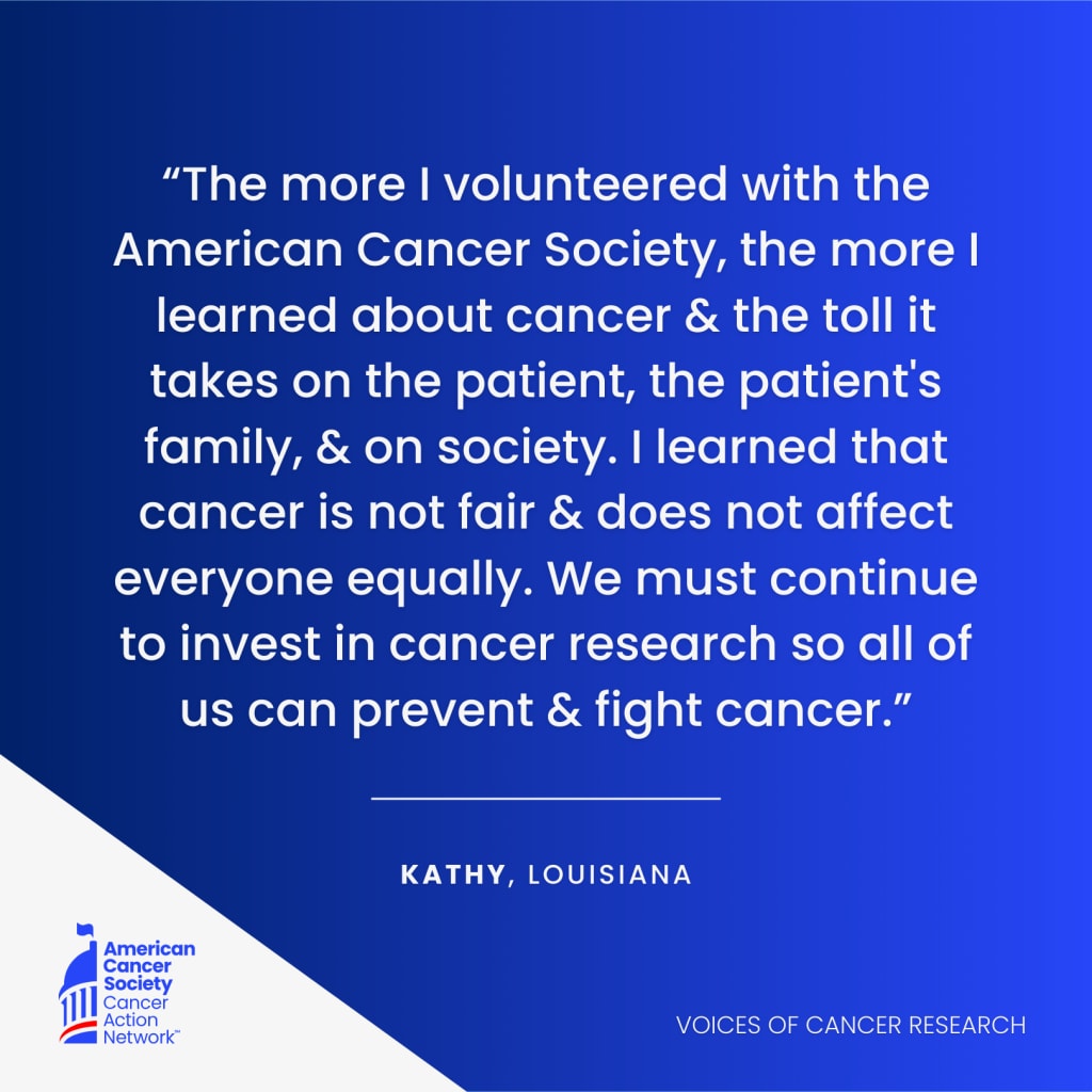Kathy believes that uniting voices can send a powerful message to legislators at all levels of government. Cancer affects nearly everyone, and Kathy’s commitment to ACS CAN reflects her dedication to turning grief into action.
