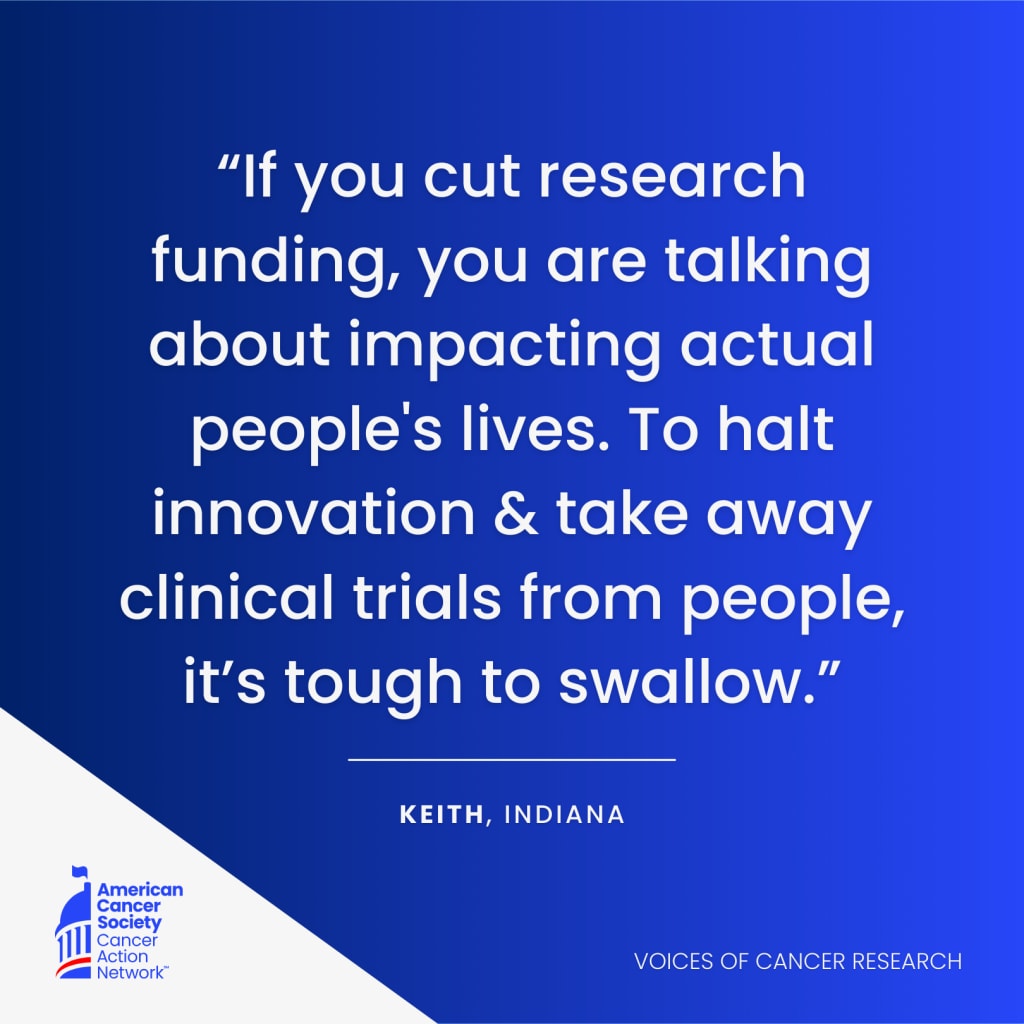 The trial he found helped to stop the progression of his cancer. Without continued investment in research, this biomarker testing and a clinical trial would not have been available to Keith. Keith continues to tirelessly advocate for continued investment in research so all cancer patients can have the best options.