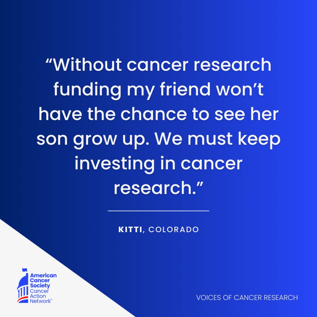 Kitti has dreams for her children and she knows that her friend shares these dreams for her son too. “I want my best friend to live a long full life, a life where she can see her son graduate high school and college, to see him start a family of his own.” Her friend deserves a chance to see her son grow up, but without the continued funding of cancer research, her treatment options are limited. Cancer research funding is vital for her and all cancer patients.