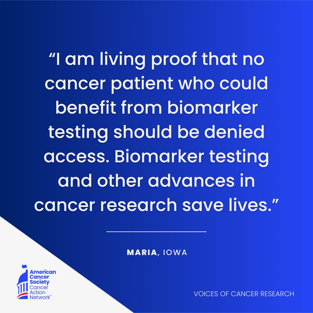 Due to advances in cancer research, the biomarker testing led Maria to the treatment she needed. She is living proof that advances in cancer research, such as biomarker testing, save lives.