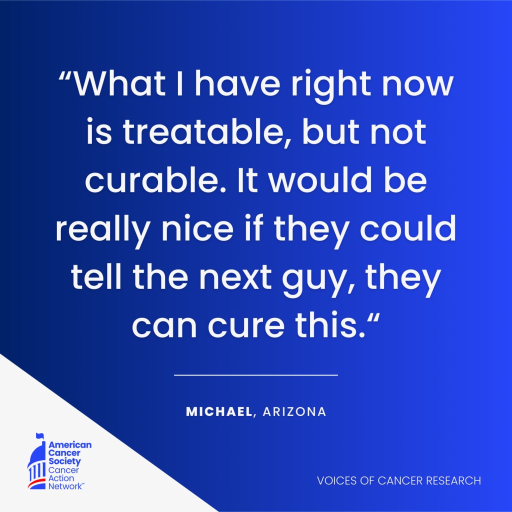 Michael worked at a manufacturing plant while receiving five rounds of chemotherapy, but was given Fridays off so he could rest and recover after treatment. The type of materials in the plant where he worked necessitated wearing a mask and respirator to avoid breathing in anything he was working with. Following cancer treatments, continuing in this physically taxing job was unsustainable, so Michael retired early to help take care of his sons. He continues to get checked every three months and is grateful for what he considers “bonus time” thanks to cancer research.
