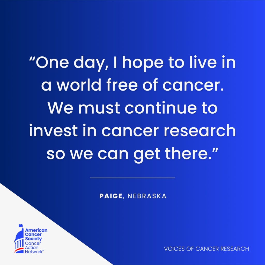 One day I hope to live in a world free of cancer. We must continue to invest in cancer research so we can get there.